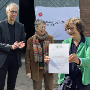 Für die Renovierung und den Ausbau des Petershofs hat die „Machbarschaft Petershof e.G.“ eine finanzielle Förderung von der NRW-Stiftung erhalten. Prof. Dr. Barbara Schock-Werner, die Vizepräsidentin der NRW-Stiftung, überreichte den Vertreterinnen und Vertretern des Projekts Petershof am Dienstag, 14. April 2026, im Rahmen eines kleinen Empfangs die Förderurkunde.