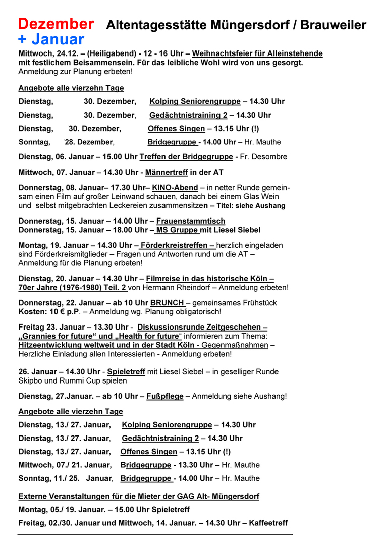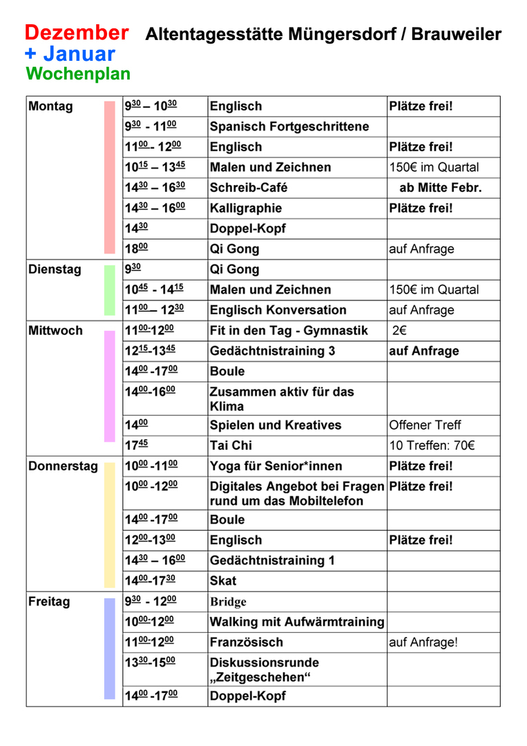 Weiter unten Details. Soweit nicht anders angegeben, gilt ein Wochenplan über den angegebenen Monat hinaus. Einzelheiten am besten direkt in der Altentagesstätte erfragen.